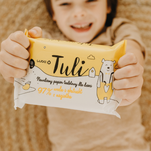 Nawilżany papier toaletowy dla dzieci Luba Tuli na bazie 97% wody i kwasu mlekowego oraz ekstraktu z nagietka